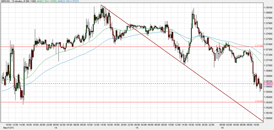 Краткосрочная поддержка выражена восходящей оранжевой линией, проложенной на часовом графике по вершинам 4 мая 1.5150 и 5 мая 1.5218; ее проекция на 1.5730 указывает на внутридневную контрольную точку для «кабеля».