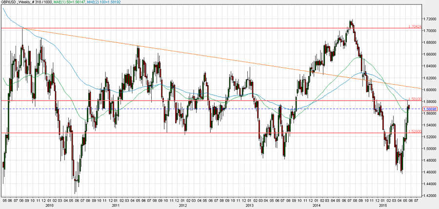 GBP/USD продолжила интенсивный рост после преодоления долгосрочного сопротивления 1.5485 и остановилась на отметке 1.58147, совпадающей с подтвержденным статическим уровнем. Как показано на недельном графике, 1.5810 оказывался контрольной точкой в июне, декабре 2009 г., июле 2011 г., ноябре 2012 г. и декабре 2014 г. Принимая во внимание большое значение этого статического уровня, вероятным сценарием является развитие коррекционного движения по GBP/USD.